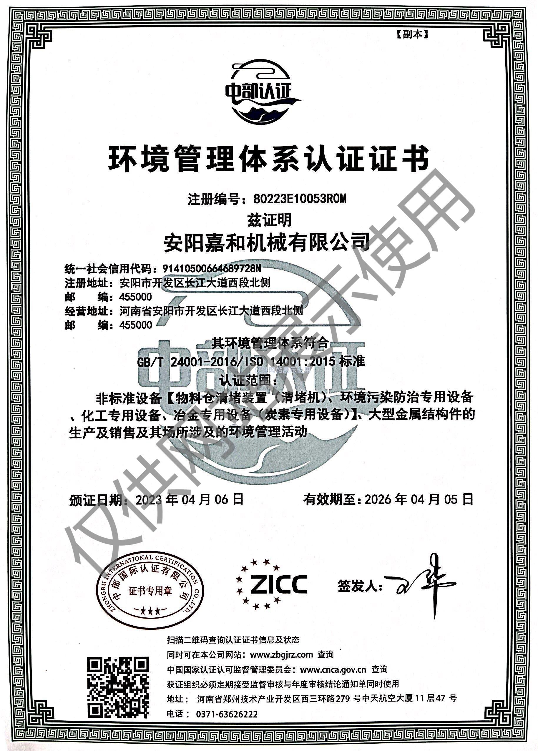 环境管理体系认证证书
